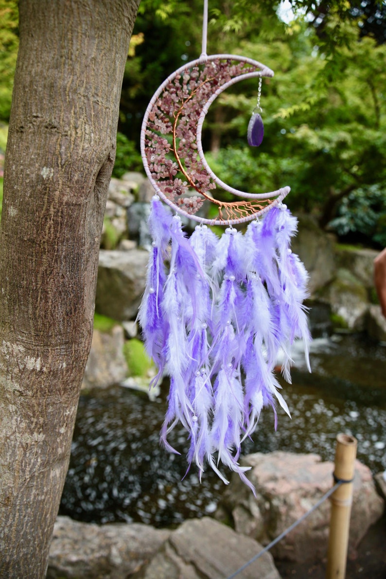 Enhance your space with our enchanting Amethyst crescent moon Crystal Dreamcatcher, designed to bring positivity and protection. Adorned with shimmering crystals, this stunning piece not only captures dreams but also adds a touch of elegance to your home decor. Each dreamcatcher is handcrafted with love, making it a unique addition to any room. Perfect as a gift for loved ones or as a special treat for yourself, our Crystal Dreamcatcher blends traditional artistry with modern flair. Transform your dreams into reality today!